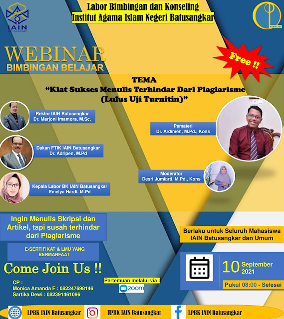 Labor Bimbingan dan Konseling telah menyelenggarakan Webinar Bimbingan Belajar di IAIN Batusangkar, Jumat (10/9/2021). dengan tema “Kiat Sukses Menulis Terhindar Dari Plagiarisme (Lulus Uji Turnitin)“. webinar dilakukan secara Daring (dalam jaringan) melalui via zoom. webinar diselenggarakan secara gratis dan terbuka secara umum bagi dosen, mahasiswa IAIN Batusangkar dan juga peserta umum dan lain-lain.